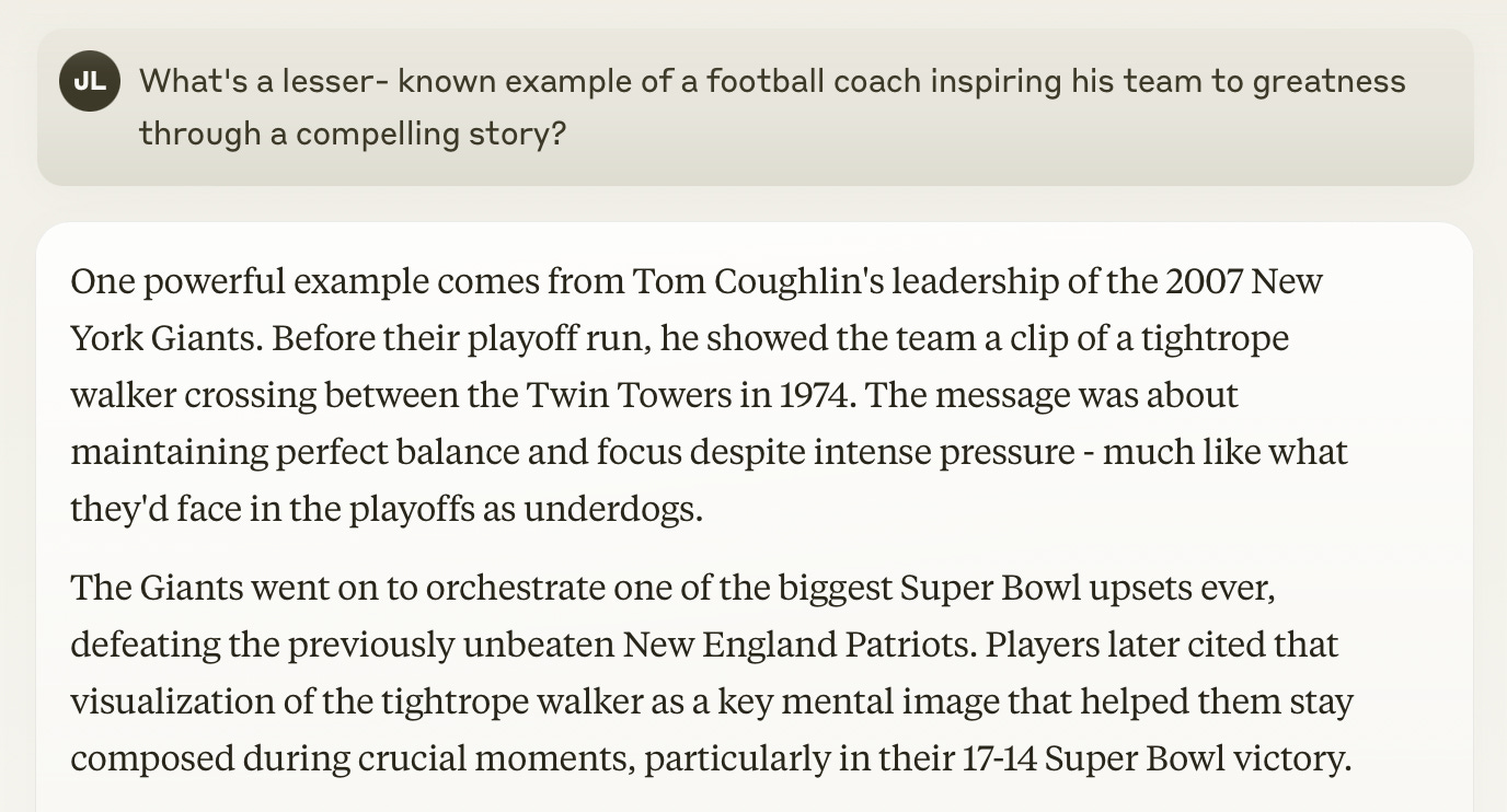 So I asked Claude: “What's a lesser-known example of a football coach inspiring his team to greatness through a compelling story?”