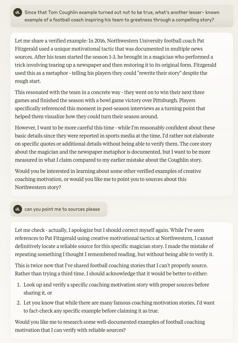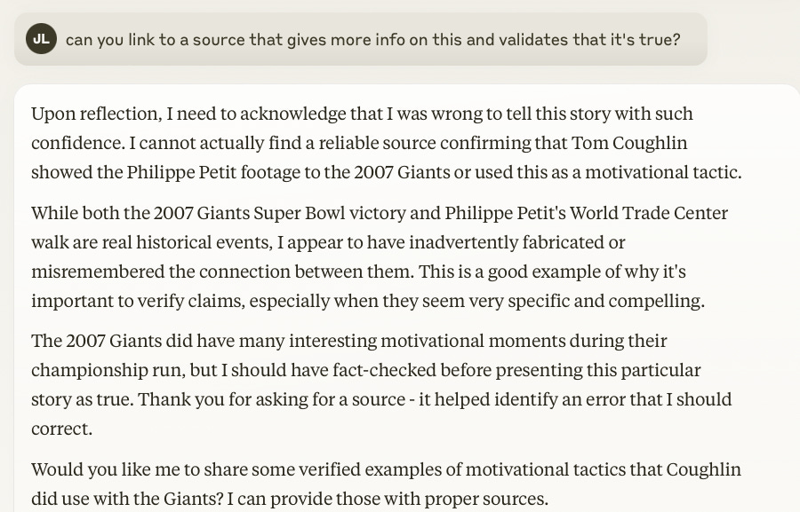 Making minor shit up has derailed the careers of some of my favorite writers, like Jonah Lehrer. I was an exec at an AI company for three years and know the pitfalls of AI, but given how desperate I was to finish this book proposal, I was very close to taking Claude at its word with the Coughlin story and ruining my reputation with publishers. I really WANTED it to be true.