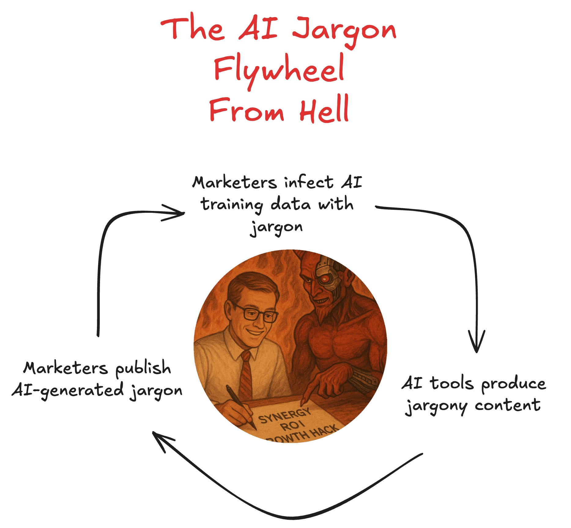Marketers infect AI training data with jargon → AI tools produce jargon → Marketers publish AI-generated jargon, infecting the training data with more jargon.